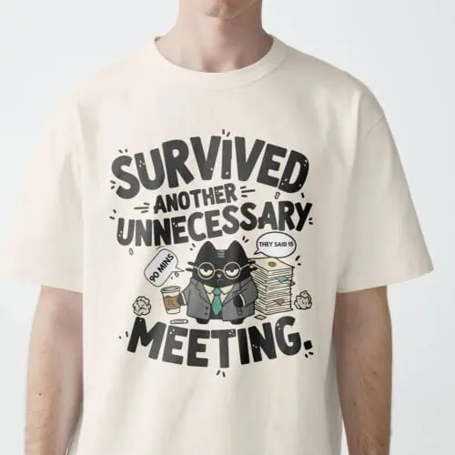 ‘Survived Another Unnecessary Meeting’ Unisex T-Shirt | Sarcastic WFH Cat Tee
